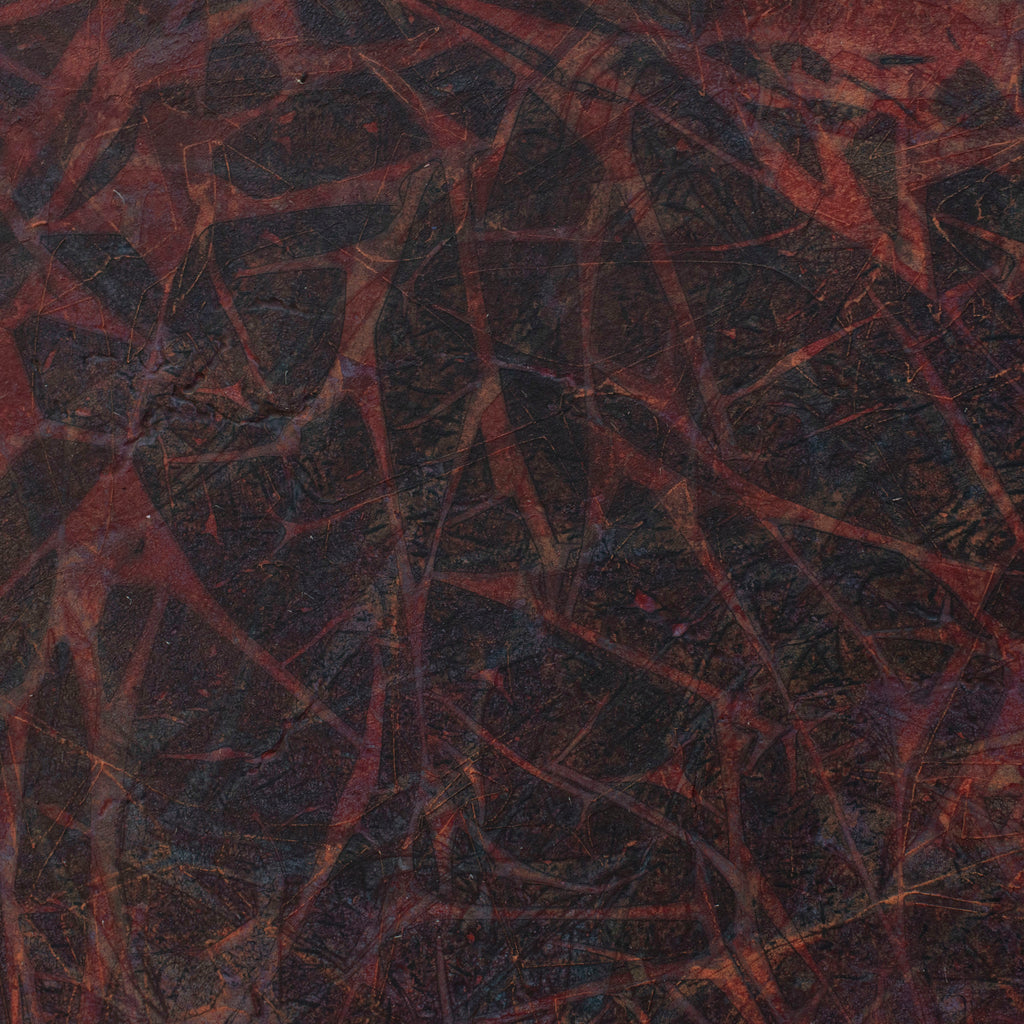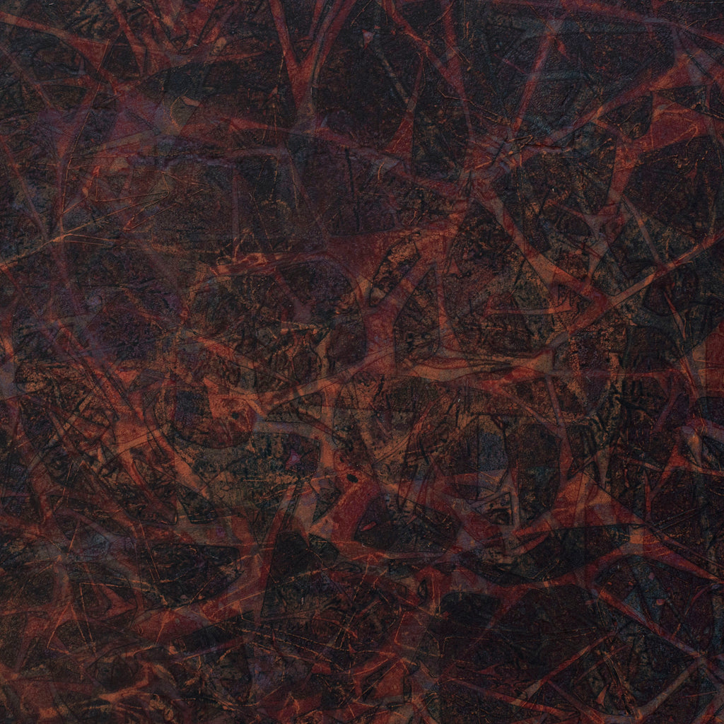 The texture and depth of this work is created by first layering marks using many different colors. I sand though the layers and harmonize the piece using several layers of glaze. Then I add surface detail to complete the painting.