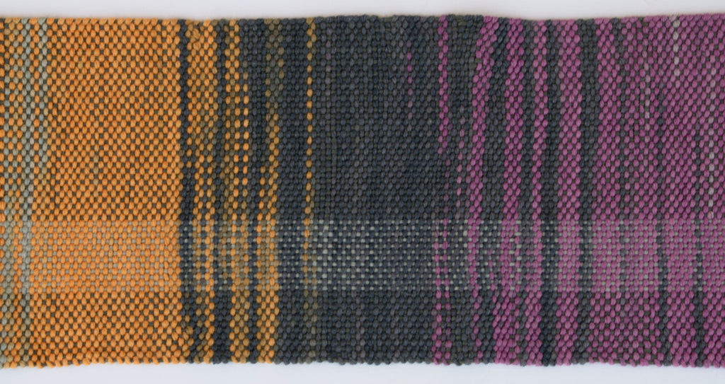 Each scarf is a unique exploration of color, texture and pattern. Because it is made using multiple fibers, the sides of the scarf become a little uneven when I do a finishing wash.