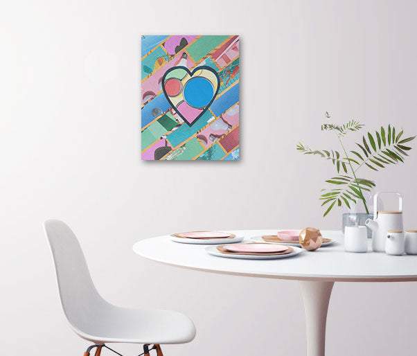 This heart collage is a one-of-a-kind piece created by layering images and text cut from discarded magazines. I use the cut pieces to make abstract designs that document my observations and feelings about the world.
