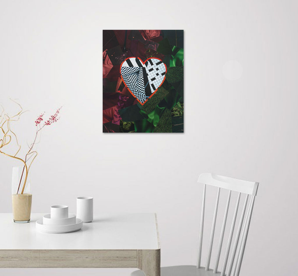 This heart collage is a one-of-a-kind piece created by layering images and text cut from discarded magazines. I use the cut pieces to make abstract designs that document my observations and feelings about the world.