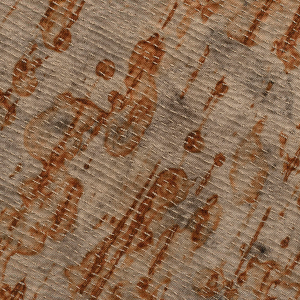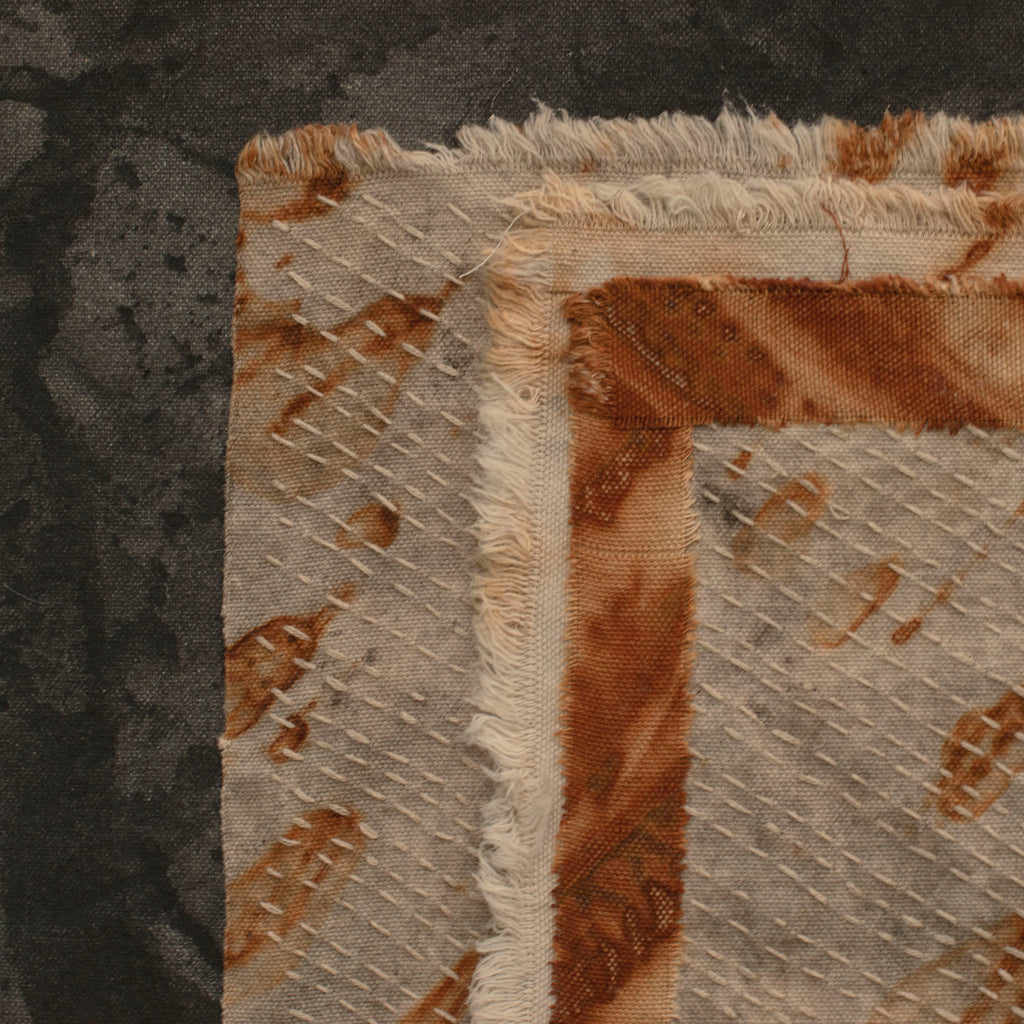 The rusty metal and leaves are applied in layers, and each layer takes many weeks to develop. The background was painted with bone black powder and soy milk to bind the dry pigment to the canvas. Contemplative hand stitching enhances the design and gives the piece texture.