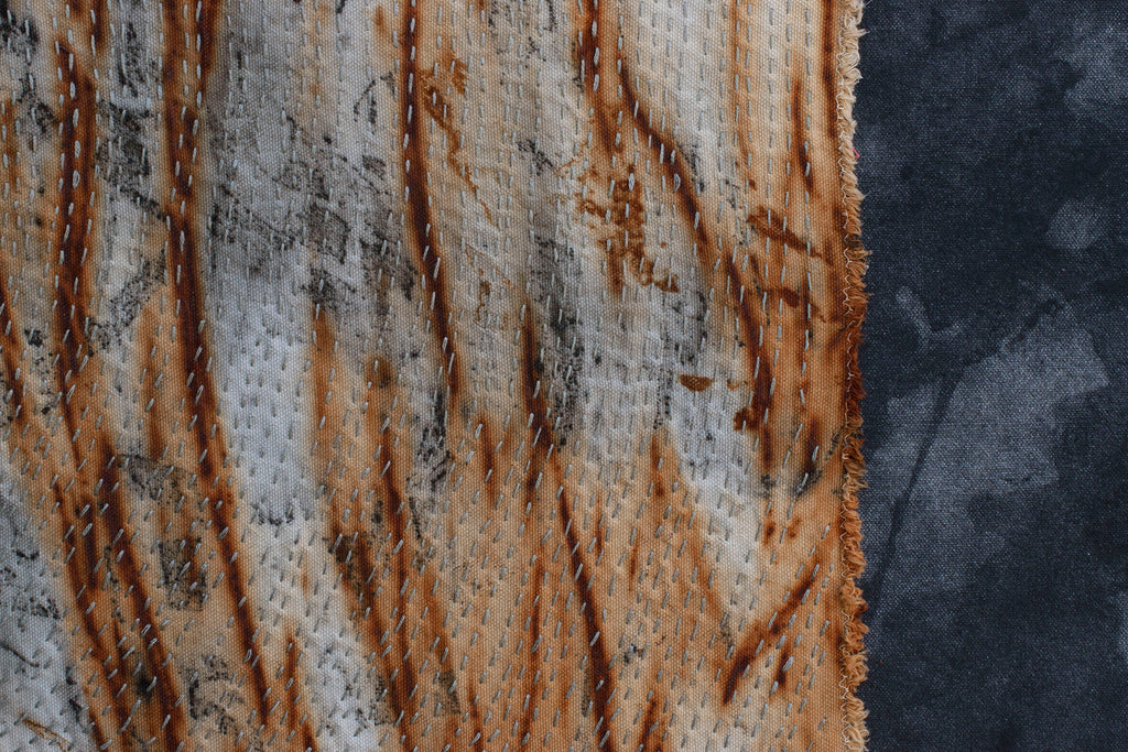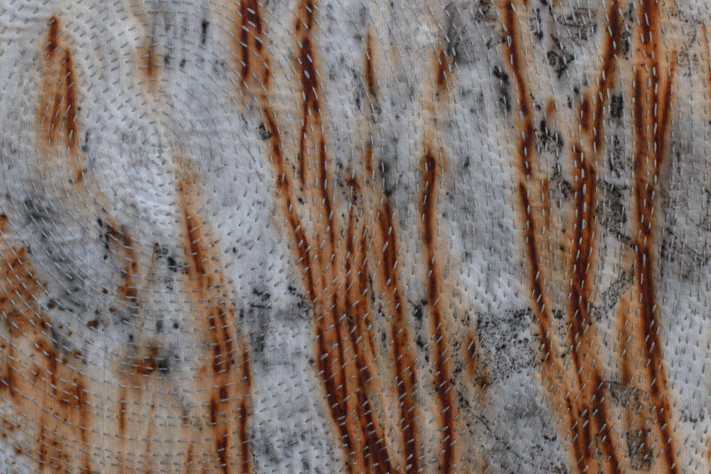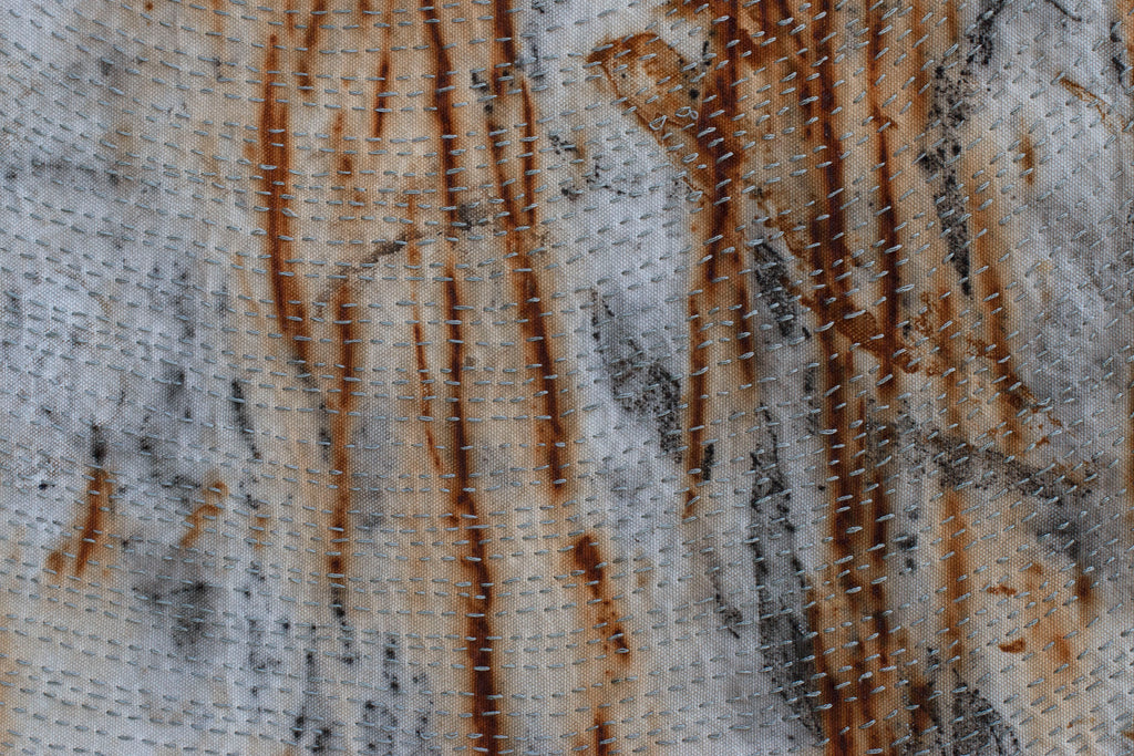 - iron oxide, leaf prints, natural earth pigments and hand stitching on canvas
