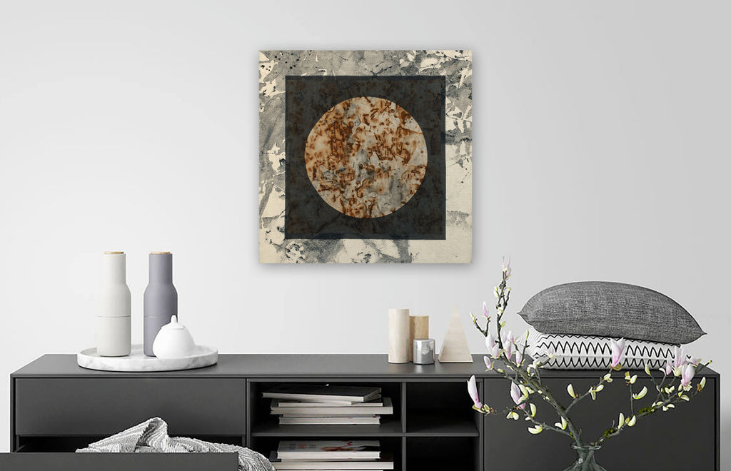 - iron oxide, leaf prints and natural earth pigments on canvas