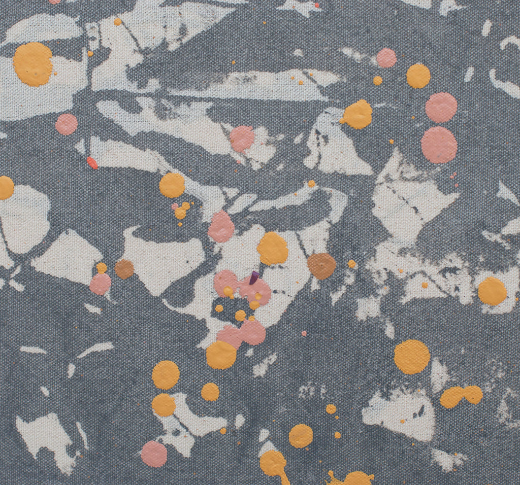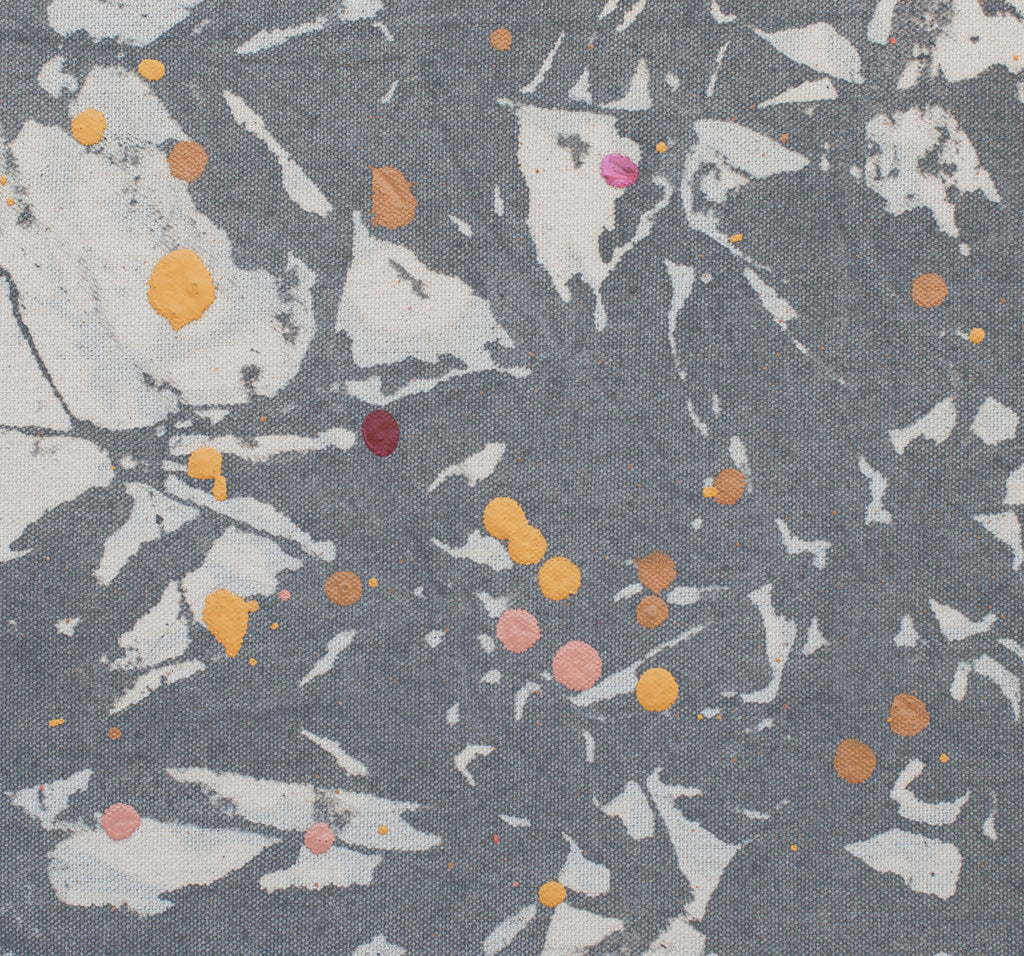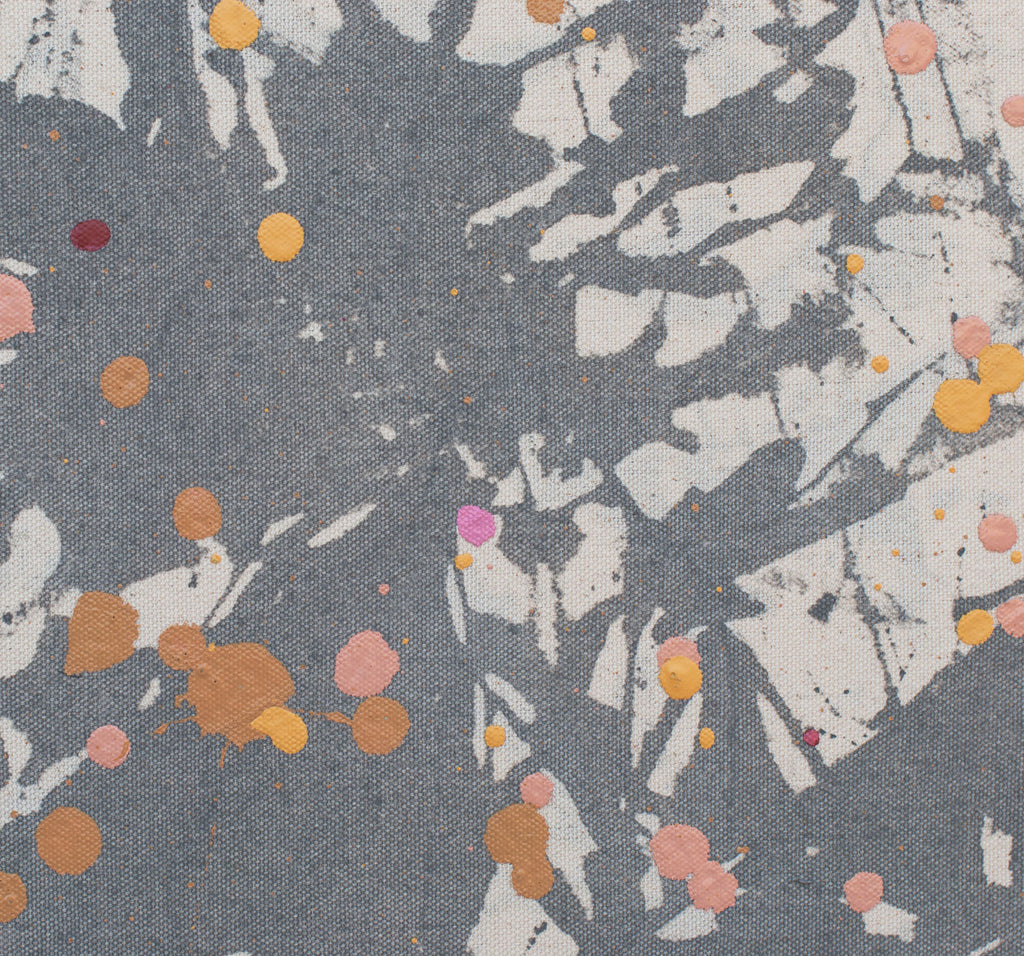 I did the gray background for this piece, and set it aside on the floor, where it accidentally acquired some drips from other paintings I was working on. I liked the effect and decided to go for it, adding more drips in more colors.