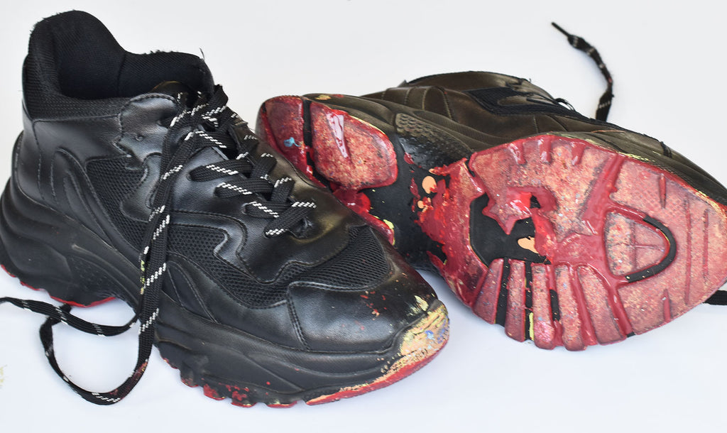 I search for shoes with interesting soles at local thrift stores. After deciding on my design, I put the shoes on, step in paint, and walk on the canvas to create the piece.