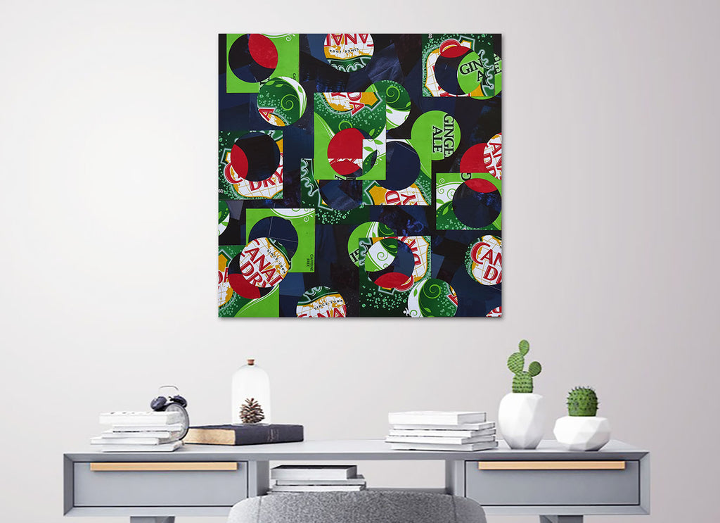 Using circular bubble shapes, this collage is based on the carbonated bubbles in Canada Dry Ginger Ale. It's a one-of-a-kind piece created from found trash. I use the trash to create a dynamic design on top of a background made using images cut from discarded magazines.
